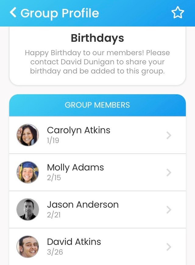 The picture below shows the birthday group in the Online Member Directory app . To view it in our demo directory, go to https://grace.ctrn.co and log in with username demo password grace